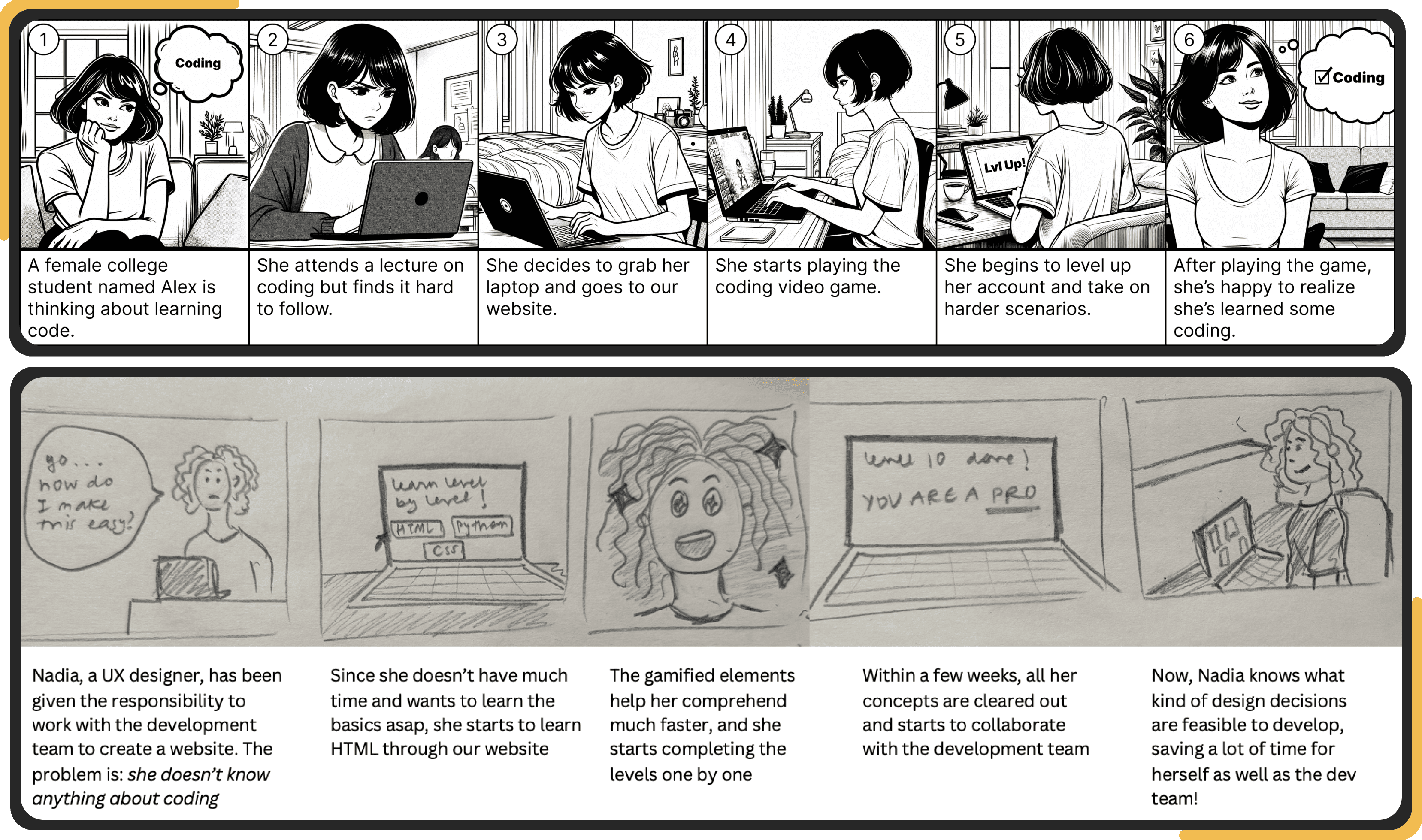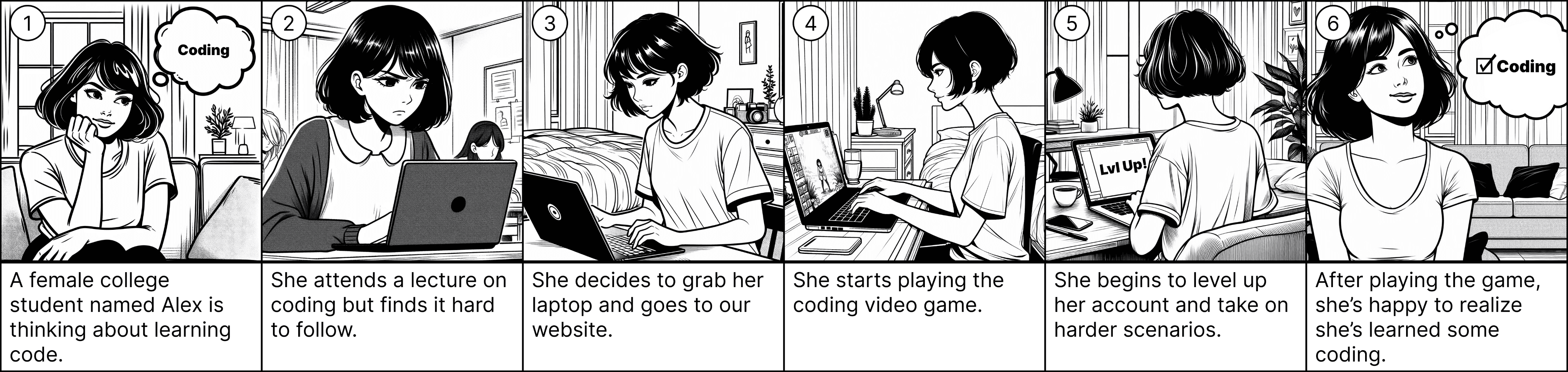 We developed two storyboards covering scenarios of users’ using Code Adventure.