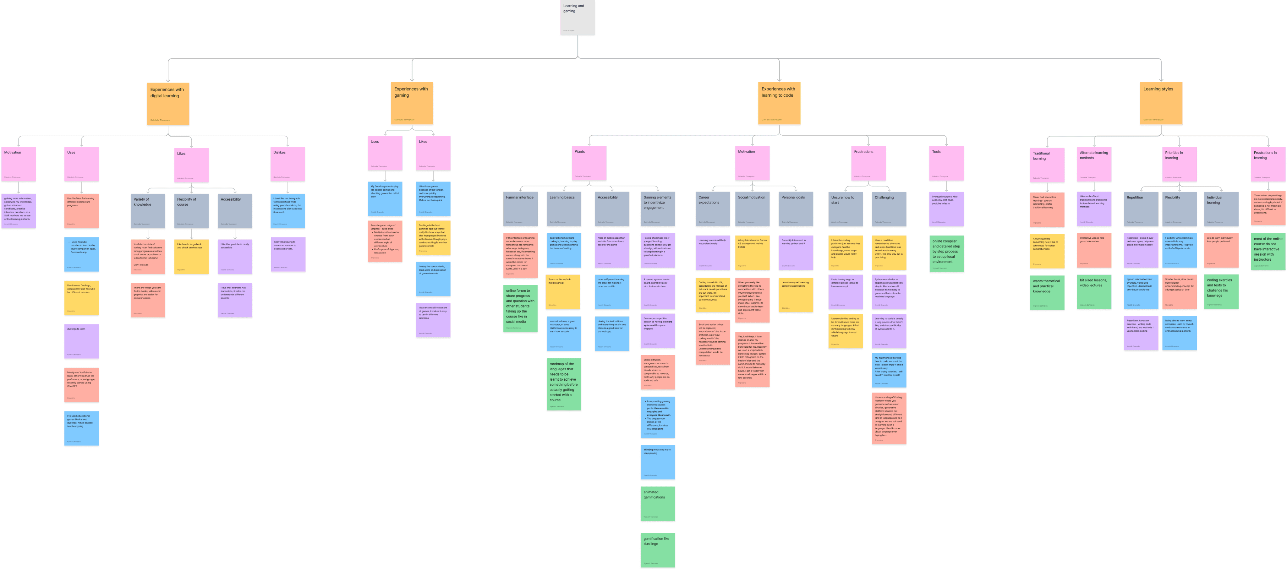 We interviewed potential users to get insight into their experience with online learning platforms, learning preferences and challenges, experiences with educational and casual gaming, coding interest and experience, and their thoughts on using gaming elements to learn coding. We created an affinity map based on our interview results to illustrate common themes and feedback.