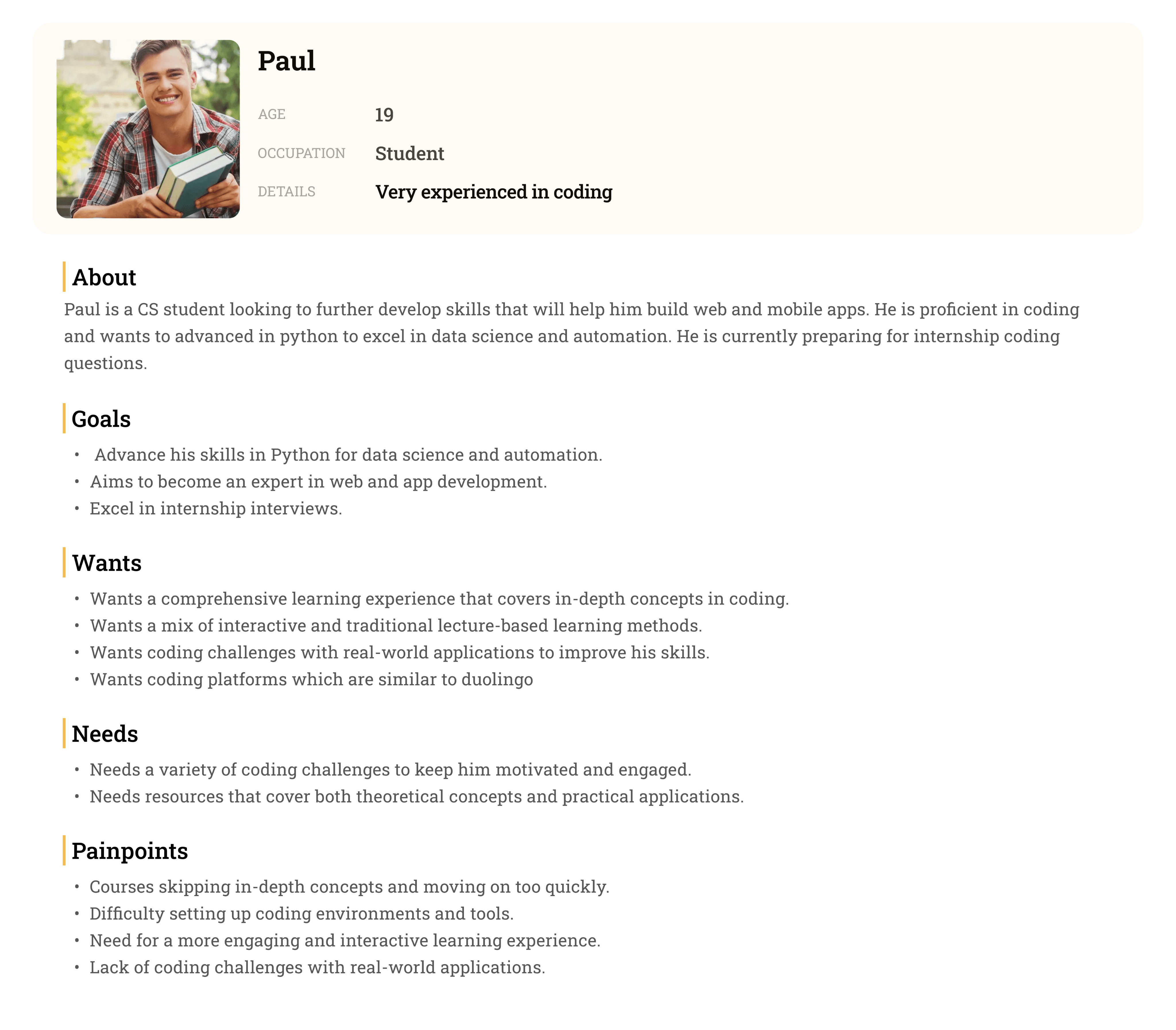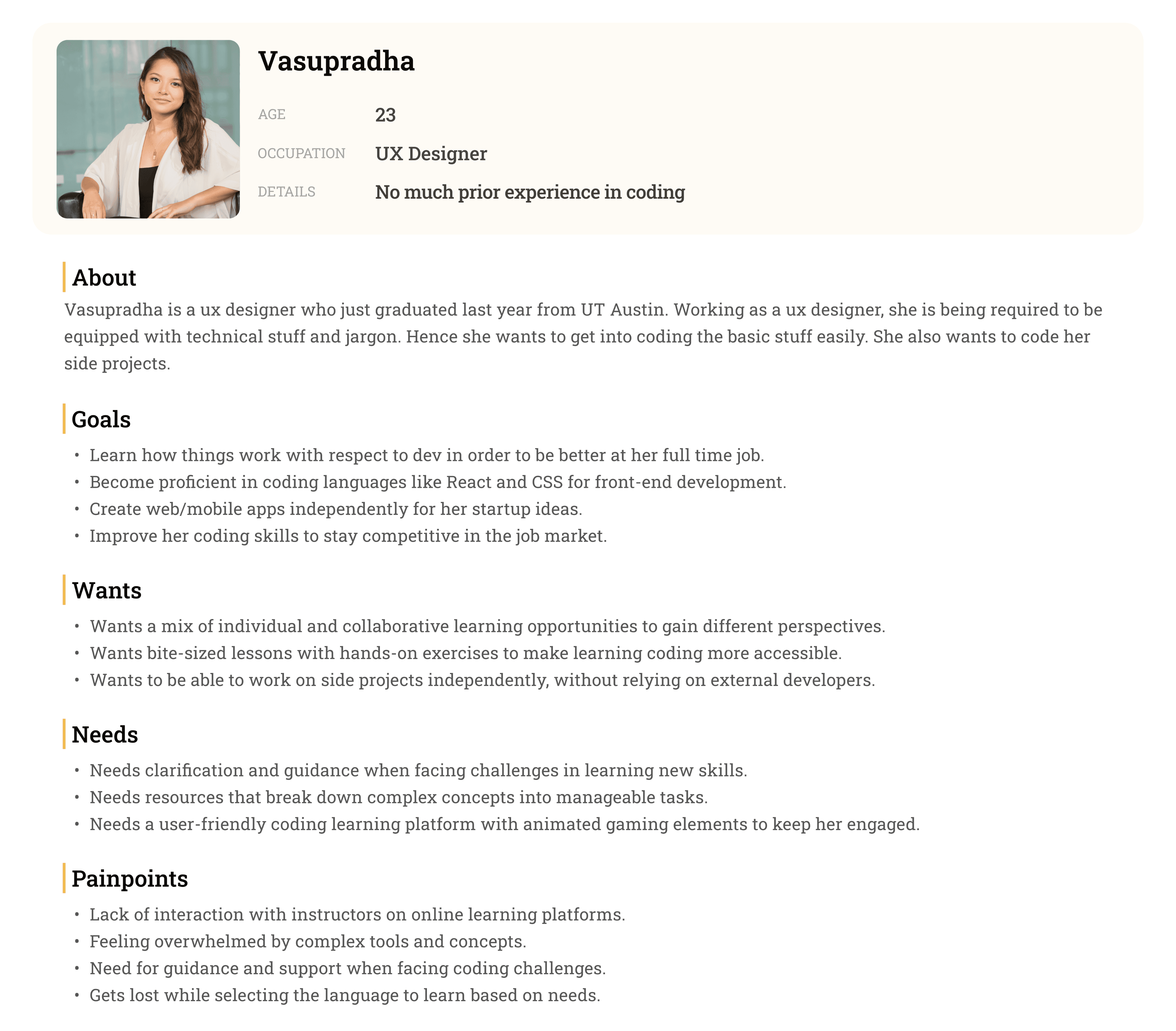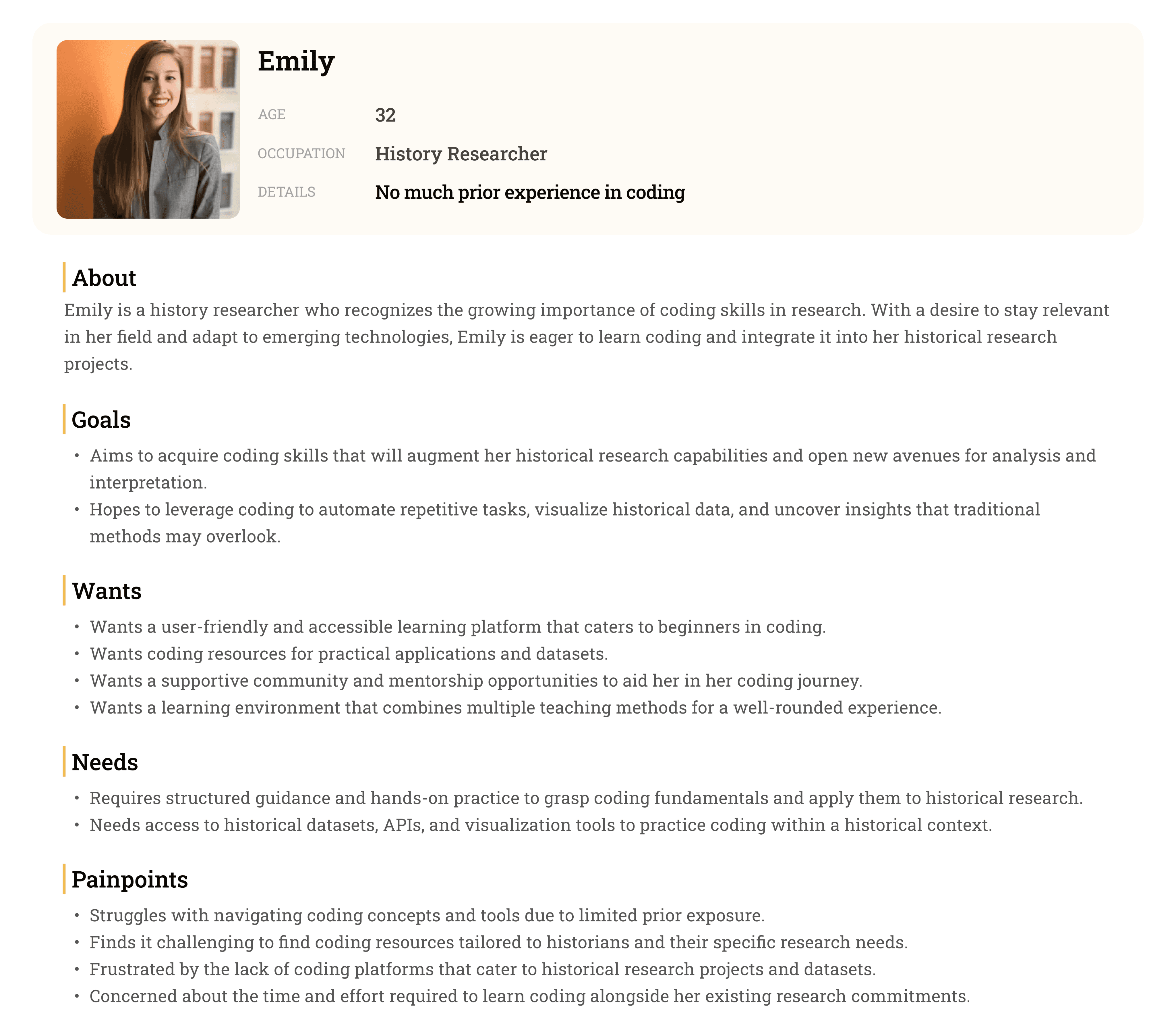 Our next step was to develop personas for three types of potential users. The personas served as a reminder of our different users’ needs, wants, and goals