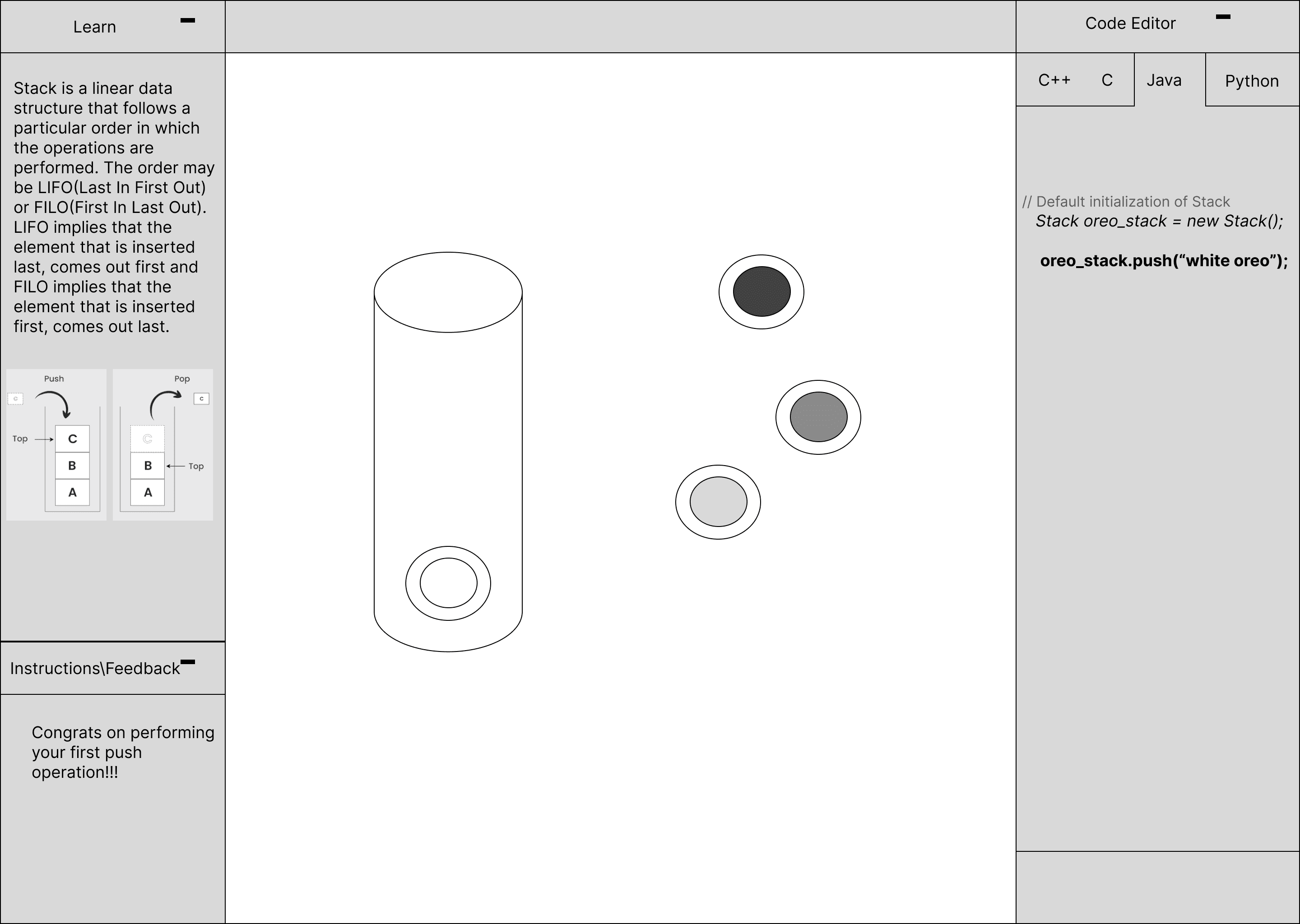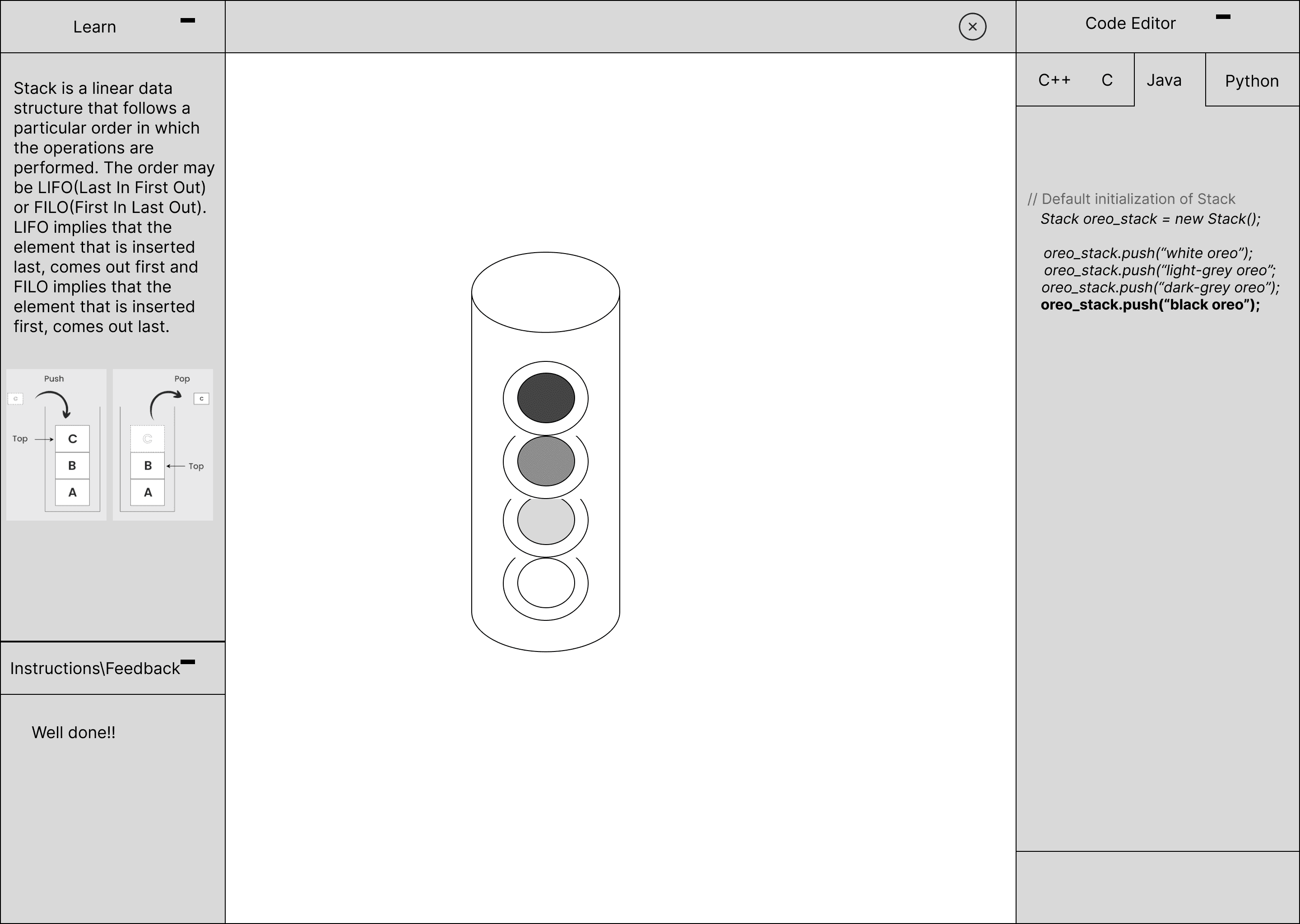 The goal of this project was to design a solution to help teens, college students, and young adults with little to no previous coding experience learn how to code. We sought to lower the obstacles of learning coding to help more people grasp coding fundamentals and understand how code function.