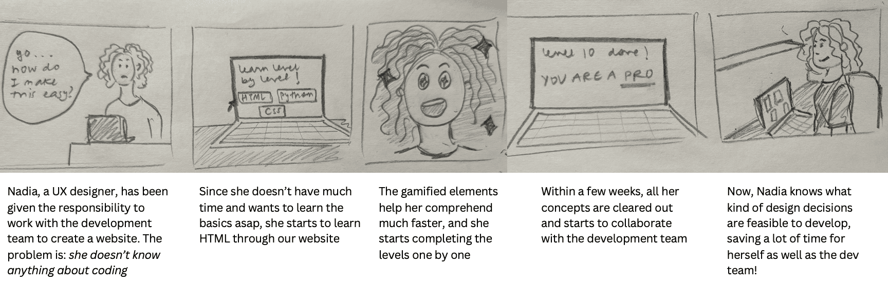 Due to time constraints and a limited number of people we weren’t able to create prototypes for additional levels or lessons. Had it been possible, I would’ve recruited more people to work on creating prototypes for both. Another thing I wish we did was to talk to subject matter experts which would be people who regularly teach code to others. We could have benefited from what they’ve seen from their experience teaching and received more insight into things like how to structure our lessons and levels, what content to include, and what things seem to help people learn different coding concepts.